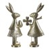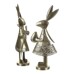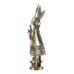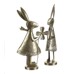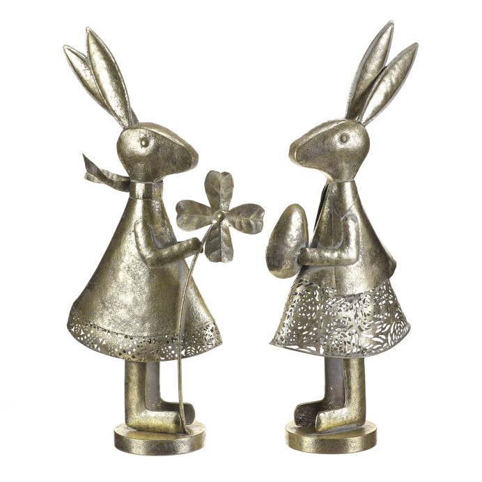 Kovová dekorace ve tvaru zajíce v zlatém provedení přináší do interiéru jemný dekorativní prvek s originálním designem. Figurky mají detailně zpracované perforace na sukních, které vytvářejí zajímavý vizuální efekt a zároveň dodávají lehkost celkovému vzhledu. Každý zajíc je vyroben pro postavení na rovný povrch, což umožňuje snadné umístění na poličku, komodu či stůl. Zlatý odstín podtrhuje slavnostní atmosféru a hodí se zejména do moderně i tradičně zařízených prostor. Dekorace jsou dostupné ve dvou variantách s různými motivy v rukou, které lze kombinovat podle potřeby.